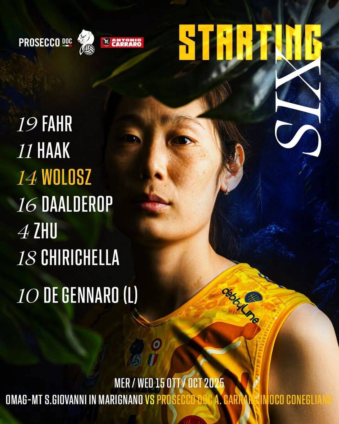 这是两队历史上的首次交手,面对首次登上A1甲级赛场的圣乔瓦尼尼女排,科内利亚诺首发阵容派出主攻朱婷、达尔德罗普,副攻法尔、齐里切拉,接应哈克,二传沃沃什,自由人德吉纳罗。替补出场球员包括了埃韦特、阿迪格韦、西拉、穆纳里尼、斯科尼亚米洛(首次代表科队登场),加比以替补自由人进行轮休。