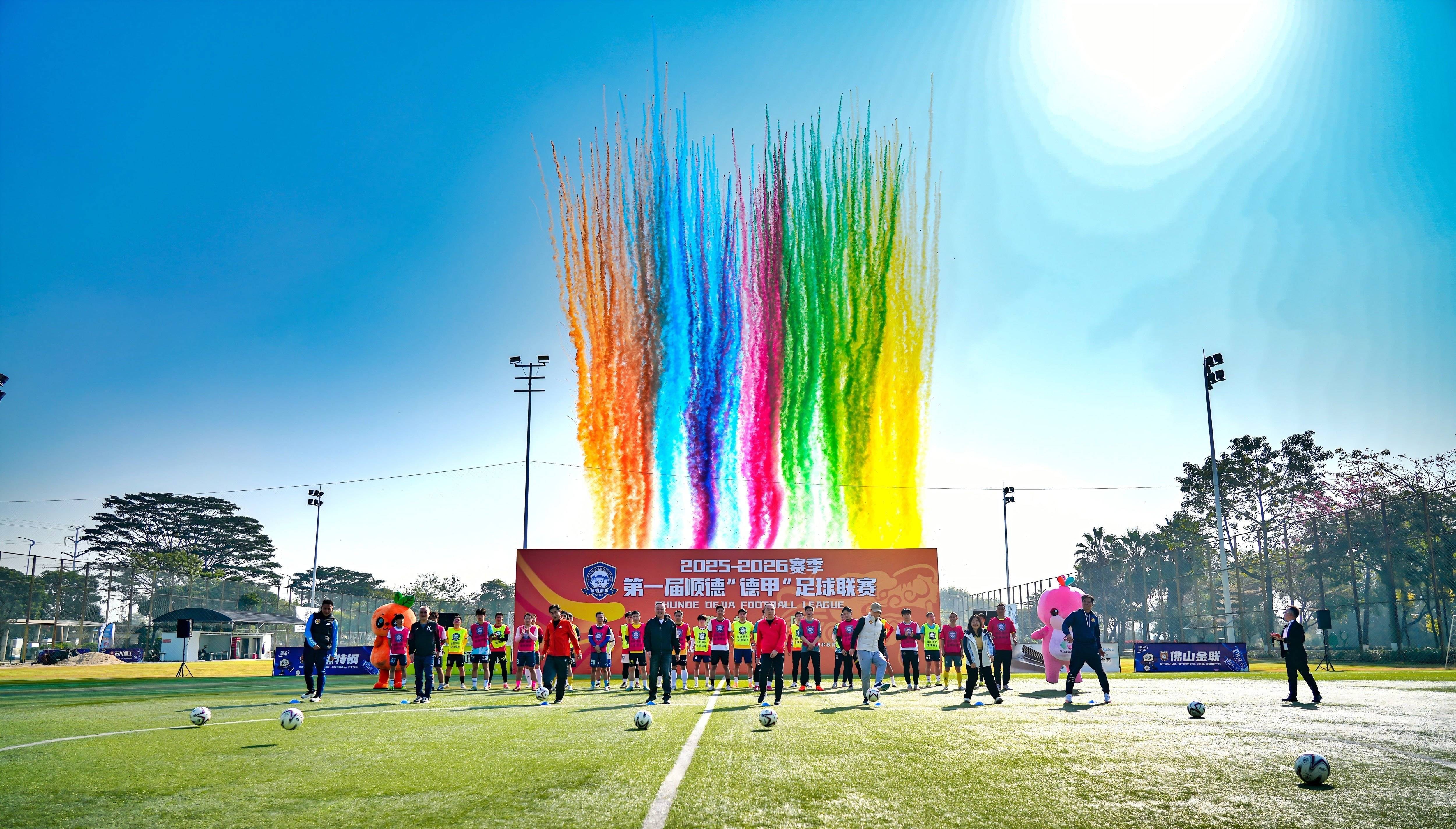 随后,在全场观众的见证下,传旗仪式、开球仪式顺利举行,现场彩烟腾空而起,标志着 2025-2026赛季第一届顺德“德甲”足球联赛陈村赛区正式启幕。