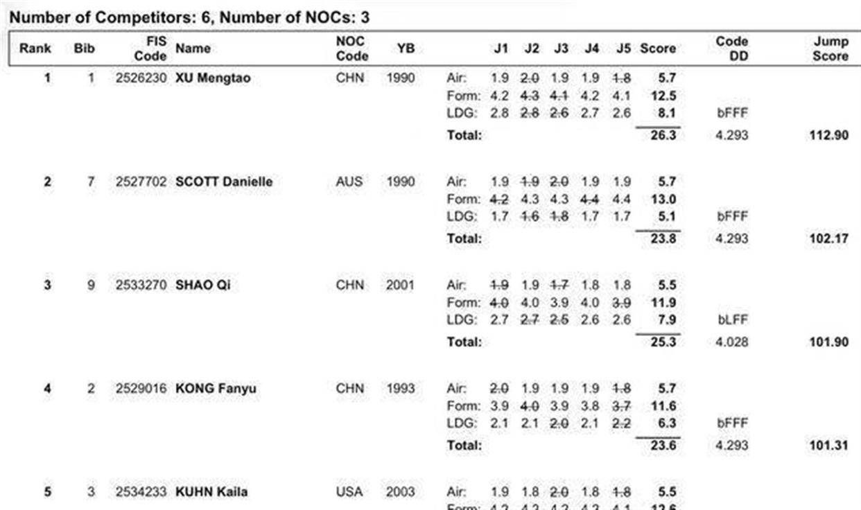 决赛规则是两轮取最好成绩,前六名进入最终的“一跳定胜负”决战轮。 首轮比赛中,徐梦桃选择了难度系数4.293得