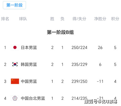 B组三轮过后,日本队、韩国队都是2胜1负,都在本轮遭遇首场败仗,中国队、中国台北队都是1胜2负,都在本轮取得首场胜利,最新积分榜如下: