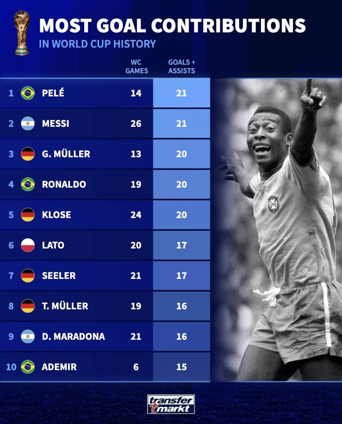 2025世俱杯,世俱杯赛程,世俱杯直播,FIFA俱乐部世界杯,世俱杯分组,世俱杯中国球队/FIFA世俱杯2025赛季将在美国举行,本站提供最新比赛时间、球队阵容、16强对战表、实时比分与免费高清中文直播入口。近日,德国转会市场公布了一份引人瞩目的世界杯历史“进球 助攻”榜单,这份榜单不仅记录着绿茵场上的辉煌瞬间,更串联起几代足球巨星的传奇故事。